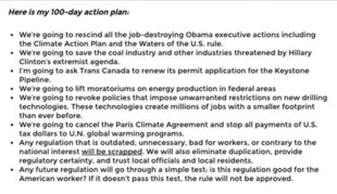 W imię powrotu do „dawnych dobrych czasów”, prezydent elekt w swoim programie wyborczym obiecał zniesienie „niszczących miejsca pracy” przepisów ochrony środowiska, położenie nacisku na zwiększenie wydobycia ropy i gazu, zlikwidowanie federalnego budżetu przeznaczanego na działania związane z ochroną klimatu oraz wystąpienie z zawartego w Paryżu porozumienia klimatycznego.