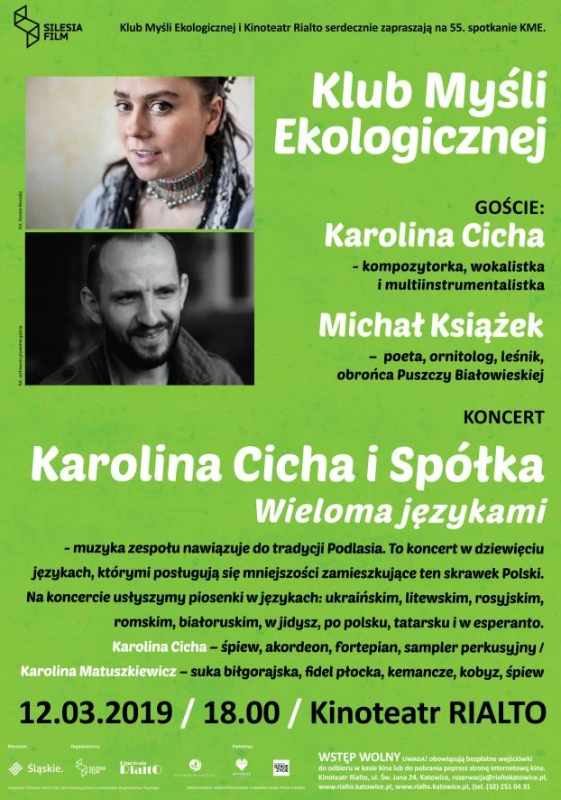 12 marca 2019 r. w Kinoteatrze „Rialto” w Katowicach odbędzie się 55 spotkanie Klubu Myśli Ekologicznej, którego gośćmi będą Michał Książek, Karolina Cichy. Po spotkaniu odbędzie się koncert „Wieloma językami”. Patronat nad spotkaniem i koncertem objął Miesięcznik Dzikie Życie.