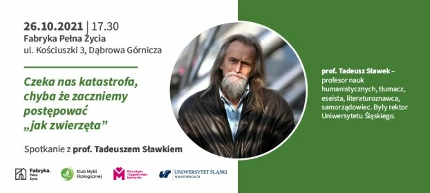 26 października 2021 r. w Dąbrowie Górniczej odbędzie się 72 spotkanie Klubu Myśli Ekologicznej, którego gościem będzie prof. Tadeusz Sławek – poeta, tłumacz, eseista, literaturoznawca, samorządowiec, były Rektor Uniwersytetu Śląskiego. Patronat nad spotkaniem objął Miesięcznik Dzikie Życie.