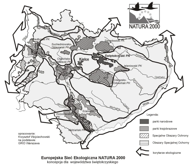 Z siecią NATURA 2000 nierozerwalnie wiąże się problematyka korytarzy ekologicznych, ponieważ to one nadają sieci spójność. Do tej pory koncepcja sieci dla całego kraju krytykowana była przez wielu przyrodników m.in. dlatego, iż korytarzy ekologicznych nie było w niej w ogóle. Opublikowana w ostatnich miesiącach przez IOP PAN książka2 prezentuje koncepcję korytarzy ekologicznych łączących obszary sieci NATURA 2000. Opracowana ona została głównie w oparciu o sieć ECONET oraz o zmodyfikowany Krajowy System Obszarów Chronionych (KSOCh). Autorzy koncepcji sieci korytarzy ekologicznych łączących obszary NATURA 2000 postulują nadanie im statusu co najmniej obszaru chronionego krajobrazu z ewentualnie podwyższonym reżimem ochronnym. Województwo świętokrzyskie dzięki rozbudowanemu systemowi przestrzennych form ochrony przyrody (52% powierzchni) jest w tej uprzywilejowanej pozycji, iż niemal wszystkie zaproponowane korytarze ekologiczne znajdują się już w granicach obszarów chronionego krajobrazu lub parków krajobrazowych. Wyjątek stanowi dolina Wisły. Projektowany system korytarzy ekologicznych pokrywa się też w głównej mierze z przebiegającymi przez teren województwa korytarzami migracyjnymi dużych ssaków drapieżnych – wilka i rysia3.