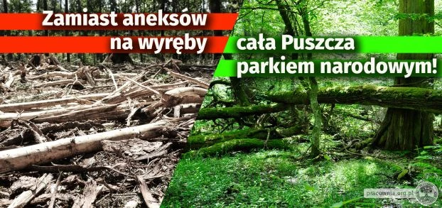 Kiedy w 1992 i 1993 r. nasi wschodni sąsiedzi utworzyli na terenie całej białoruskiej części Puszczy Białowieskiej park narodowy, a obszar ten objęto dodatkowo wpisem na Listę Światowego Dziedzictwa Ludzkości UNESCO i rezerwatem Biosfery, polscy leśnicy torpedowali plan powiększenia maciupeńkiego Białowieskiego Parku Narodowego (zaledwie 7% Puszczy) przez wycinkę najcenniejszych drzewostanów w gospodarczej części Puszczy. Pod topór poszły m.in. 300-letnie dęby, pamiętające czasy carów i królów. Szkodnicze działania leśników wywołały fale protestów. W 1994 r. w Warszawie przed Sejmem odbyła się międzynarodowa manifestacja, na którą Pracownia na rzecz Wszystkich Istot przywiozła pień 300-letniego dębu wyciętego w Puszczy. Prezydent, premier i minister ochrony środowiska otrzymali około 500 tys. listów od obywateli domagających się objęcia ochroną całej Puszczy. Na wspólnym posiedzeniu w Białowieży Państwowa Rada Ochrony Przyrody, Komitet Ochrony Przyrody PAN i Rada Naukowa BPN podejmują uchwałę i wystosowują apel do władz RP o rozszerzenie Białowieskiego Parku Narodowego na obszar całej polskiej części Puszczy Białowieskiej. Rozszerzenia parku domaga się także Rada Ekologiczna przy Prezydencie RP. Naukowcy mówili jednym głosem – Białowieski Park Narodowy jest za mały, żeby zapewnić ciągłość procesów przyrodniczych i niezagrożoną trwałość puszczańskich gatunków. Już w 1968 r. prof. Janusz Faliński pisał: „Rozpowszechniony pogląd, że utworzenie Białowieskiego Parku Narodowego zwalnia nas z troski o dalsze połacie Puszczy, jest nie do przyjęcia. Nawet gdyby park narodowy był chroniony przez najlepszych strażników i zabezpieczony najdoskonalszymi ustawami, ten obiekt przyrodniczy nie jest w stanie przetrwać dłużej niż otaczająca go Puszcza”. A Puszcza była konsekwentnie niszczona, pod coraz to różniejszymi pretekstami. Pomimo, że pod rosnącym naciskiem opinii publicznej w 1995 r. ogłoszono moratorium na cięcie stuletnich drzewostanów w całej Puszczy, a w 1996 r. powiększono obszar Białowieskiego Parku Narodowego z 7 do 16% powierzchni Puszczy, w latach 1990-2002 w polskiej części Puszczy wycięto aż 1,5 mln m3 drzew. Tylko za sprawą jednej politycznej decyzji Jana Szyszki, leśnicy w 2017 r. wycięli nielegalnie 200 tys. m3 drzew, w tym wiele puszczańskich olbrzymów: dębów, grabów, świerków, które wyjechały do tartaków w całej Polsce. Dewastację Puszczy i łamanie prawa powstrzymał dopiero Trybunał Sprawiedliwości UE i widmo wielomilionowych kar dla Polski. Niestety, nad Puszczę znów nadciągają czarne chmury.